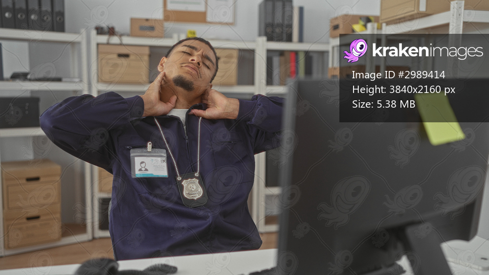 Man rubbing his neck and leaning back at a desk by a computer monitor with badge and id visible in a police building; dedication exhaustion.