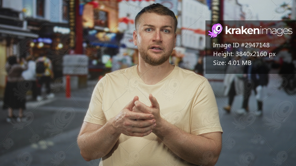 Man rubbing palms together and clasping hands on a crowded city street with closed eyes and slight beard, midwalk pedestrians behind him; concern pondering. - Kraken Images
