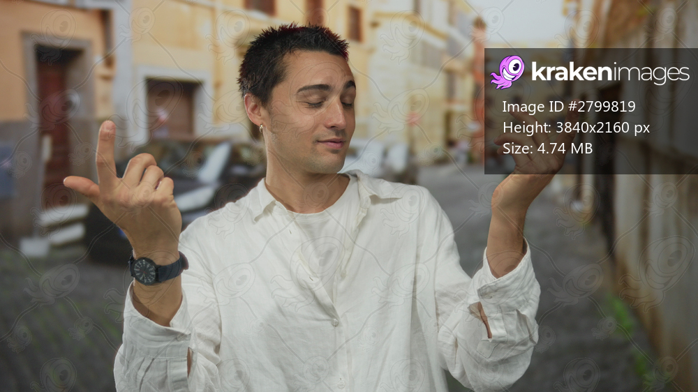 Man rubbing palms together with subtle smile on a sunlit narrow cobblestone street in urban town setting; greed.