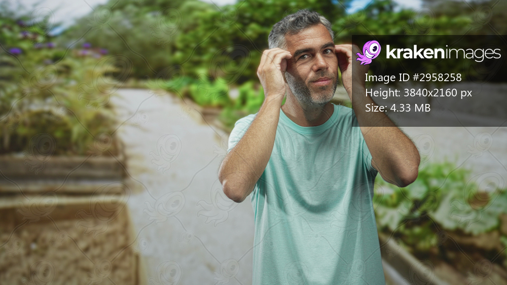 Man rubbing temples and pressing eyes with hands on a garden path lined with flowerbeds and plants near trees; stress.