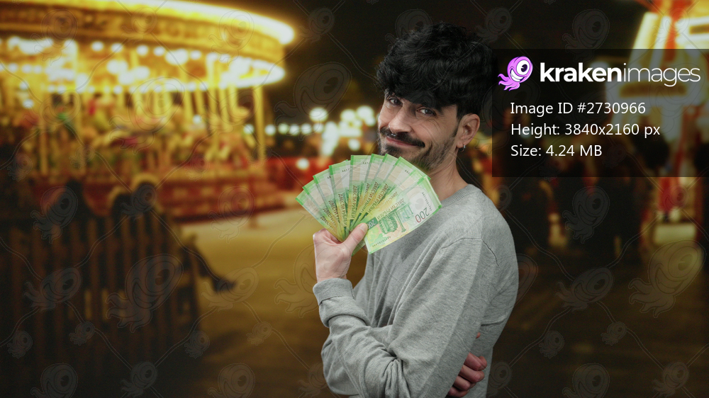 Man with russian ruble banknotes smiling at an outdoor fair, featuring vibrant lights and carousel in the background, capturing a playful and joyful moment. - Kraken Images