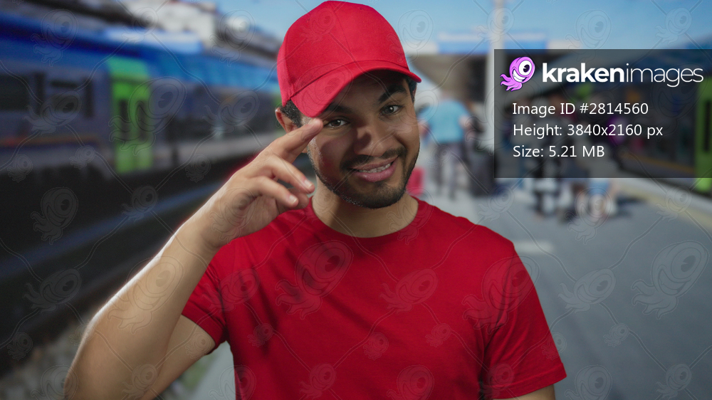 Man salutes with fingers on red cap at sunny street station platform with blurred commuters by train tracks; friendly greeting and respect.