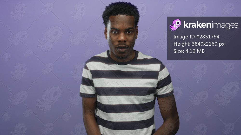 Man salutes with hand on head in bright studio setting wearing casual striped shirt; welcome connection.