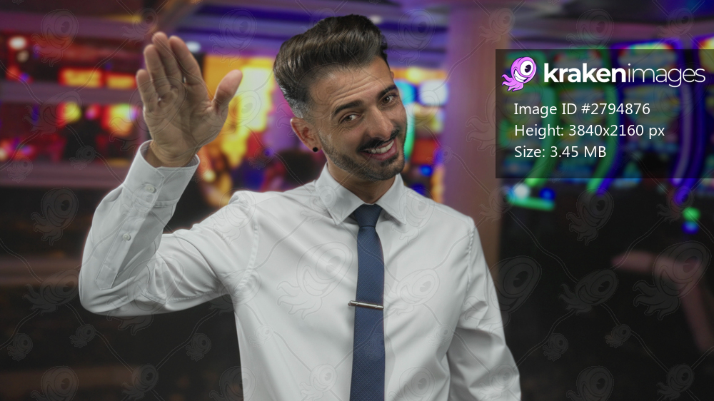 Man salutes with hand to forehead beside a row of bright slot machines in a casino building lobby; warm welcome.