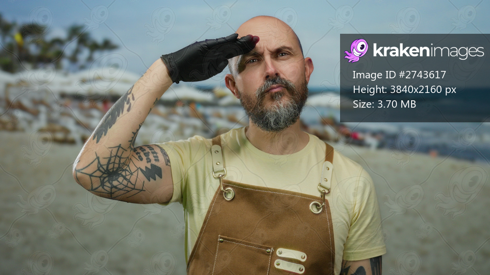 Man saluting at the seaside wearing brown overalls on a sunny day showing tattoos and beard while standing on the sandy beach with waves crashing in the background - Kraken Images