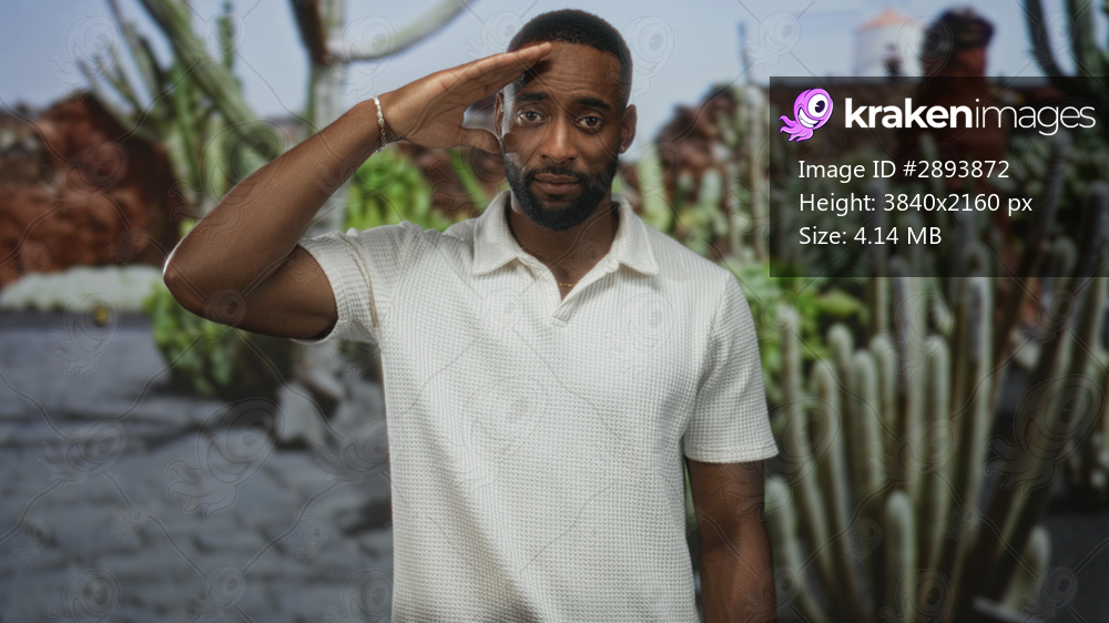 Man saluting with hand to forehead in park among cactus plants and paved path, white polo visible; respect reflection.
