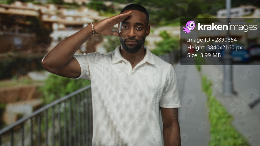 Man saluting with hand to forehead on street near railing and lamppost, wearing white polo shirt and bracelet; pride unity.