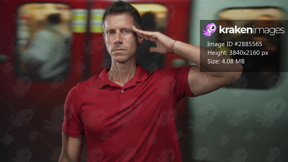 Man saluting with hand to temple at train station platform, eyes closed, red polo shirt visible, right arm raised in salute; remembrance.
