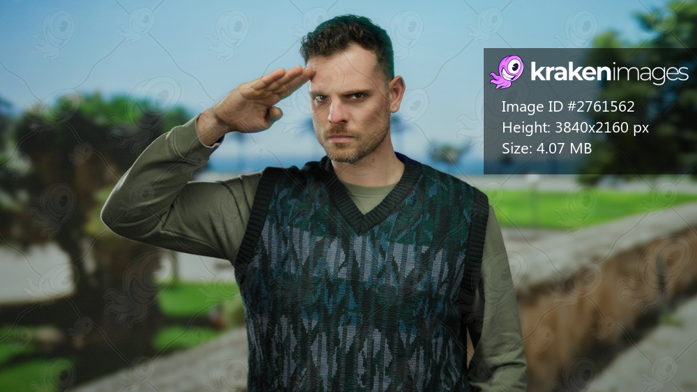 Man saluting outdoors in a park setting with a focused expression wearing a dark sweater highlighting a public space environment on a sunny day.