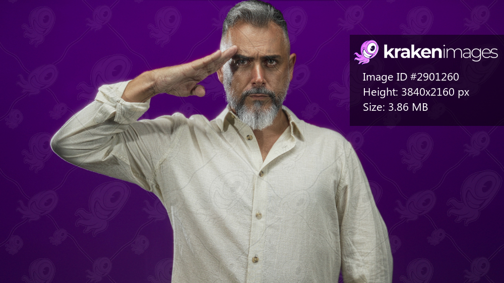Man saluting with right hand to forehead in studio with purple backdrop and beige shirt; respect duty honor.