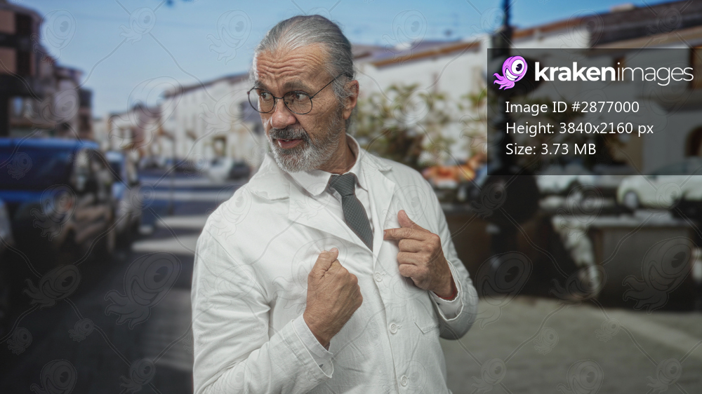 Man scientist with gray long hair and beard wearing lab coat and glasses points finger to chest on street; confidence authority experience.