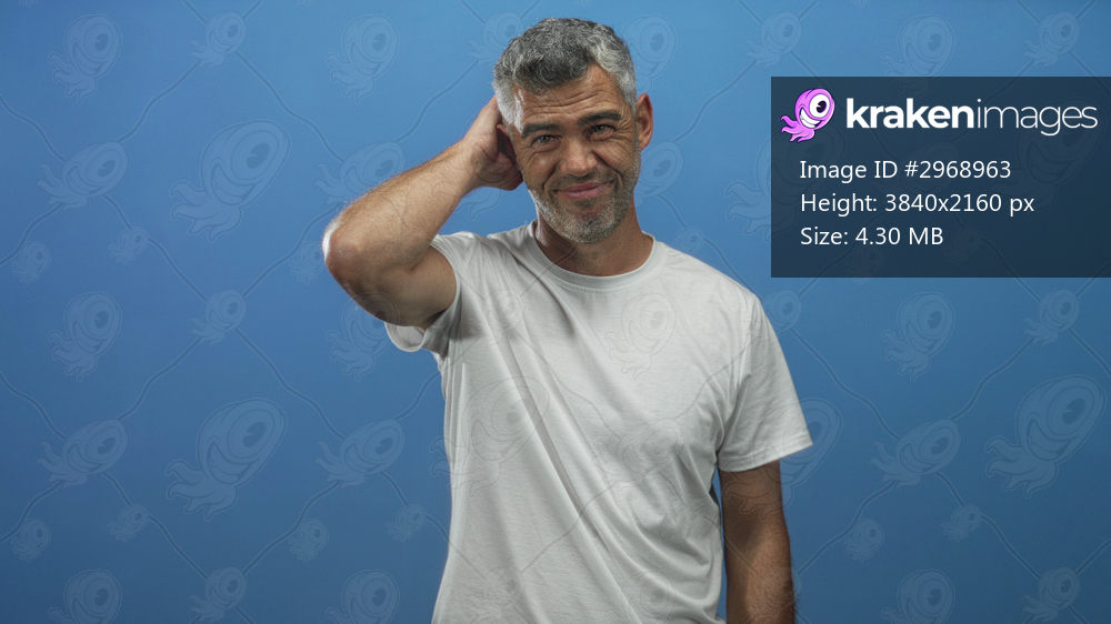 Man scratches head with hand, wearing white tshirt and showing forearm against a blue studio backdrop; awkward.