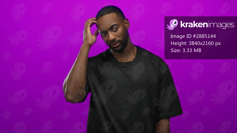 Man scratching head and touching temple with right hand in purple studio, wearing black t shirt and gold chain; confusion doubt puzzlement.