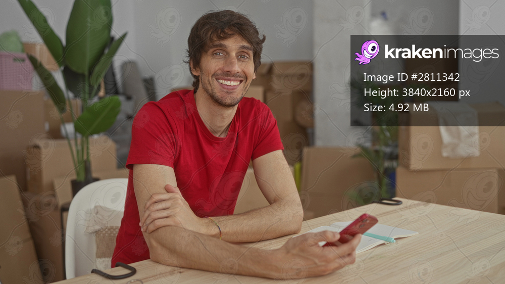 Man seated at a wooden table in a building with smartphone in hand and hand on chin reflecting on unpacked boxes; contemplation planning.