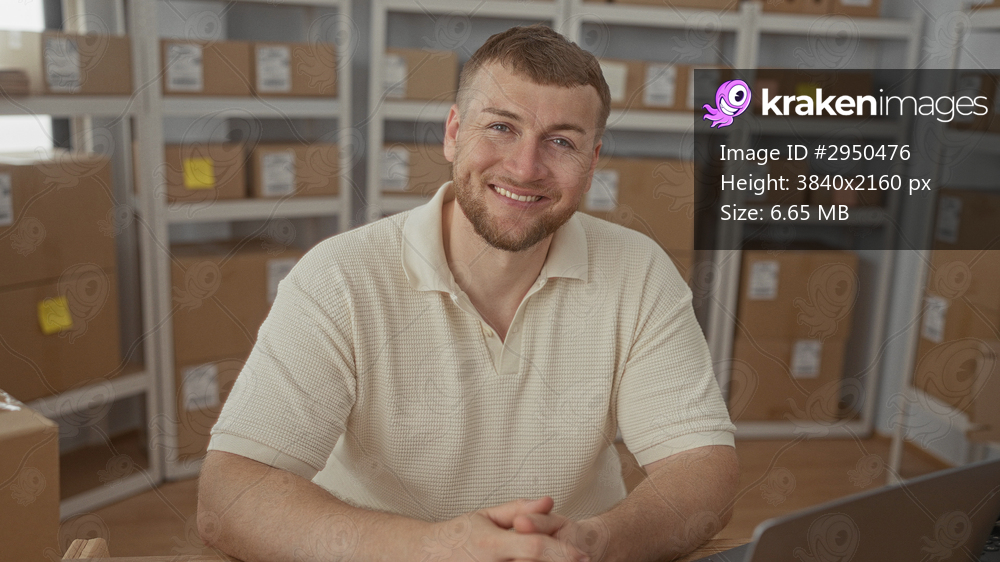 Man seated with clasped hands and cardboard parcels on shelves in building at a desk with laptop and telephone; friendly service.