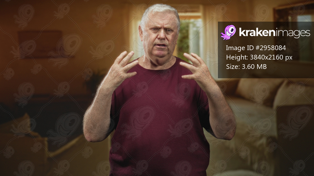 Man senior gesturing with open hands and pursed lips in a living room building, wearing maroon tshirt and standing center frame; frustration reflection. - Kraken Images