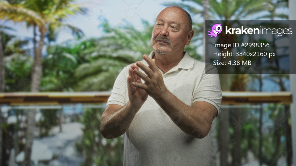 Man senior hispanic clasping hands and gesturing on a balcony in a building with palm trees and glass railing; serenity reflection.