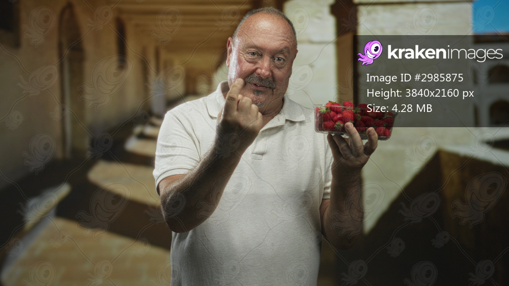 Man senior hispanic holding container of strawberries while showing middle finger to camera in sunlit building corridor; defiance.