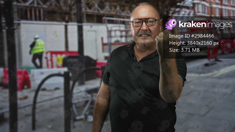 Man senior hispanic showing raised middle finger beside construction barriers and scaffolding on a street; defiance confrontation.