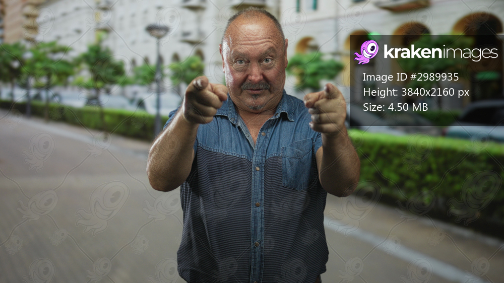 Man, senior hispanic, wearing denim shirt, beckoning with both hands on a busy city street, palms visible, pleading expression; seeking help confusion. - Kraken Images