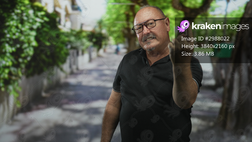 Man, senior hispanic, wearing glasses and black polo, raises his middle finger toward camera on a tree lined street walkway, hand in focus; defiance.