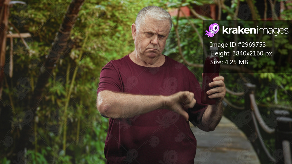 Man, senior, holding a bottle of pomegranate juice and giving thumbs down while standing on a forest wooden walkway; disapproval.