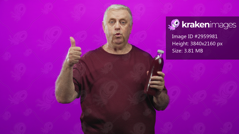 Man senior holding a bottle of pomegranate juice and pointing finger upward while showing hand gestures in a studio purple set; confidence health.