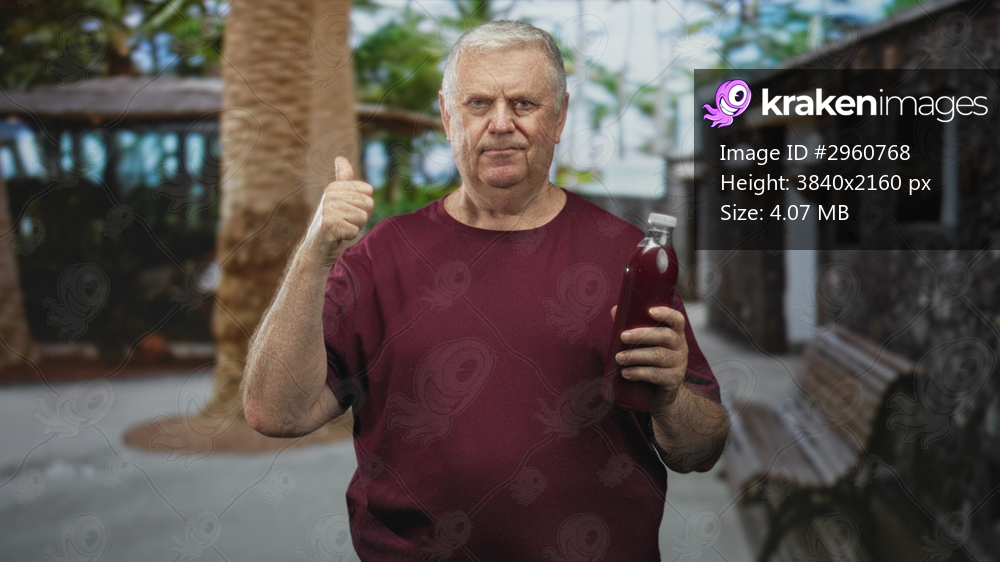 Man senior holding a bottle of pomegranate juice waves with an open hand while holding the bottle in a building walkway; health contentment.