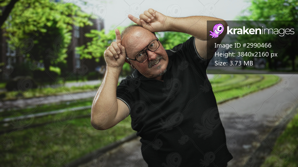 Man senior holds index fingers to head as horns while smiling on a street with tram tracks, trees and buildings; playful mischief.