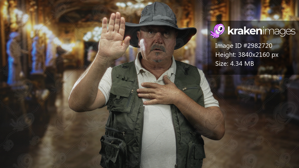 Man senior with right hand raised and left hand on chest in ornate building interior wearing fishing vest and hat; solemn duty.