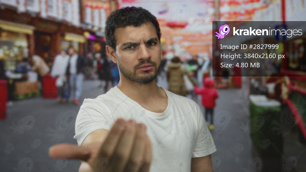 Man with serious expression beckons with outstretched hand and points finger on colorful street; invitation connection.