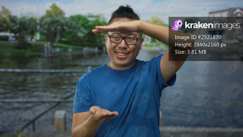 Man shading his eyes with one hand and holding an open palm with the other on a street in amsterdam by a canal; playful curiosity.