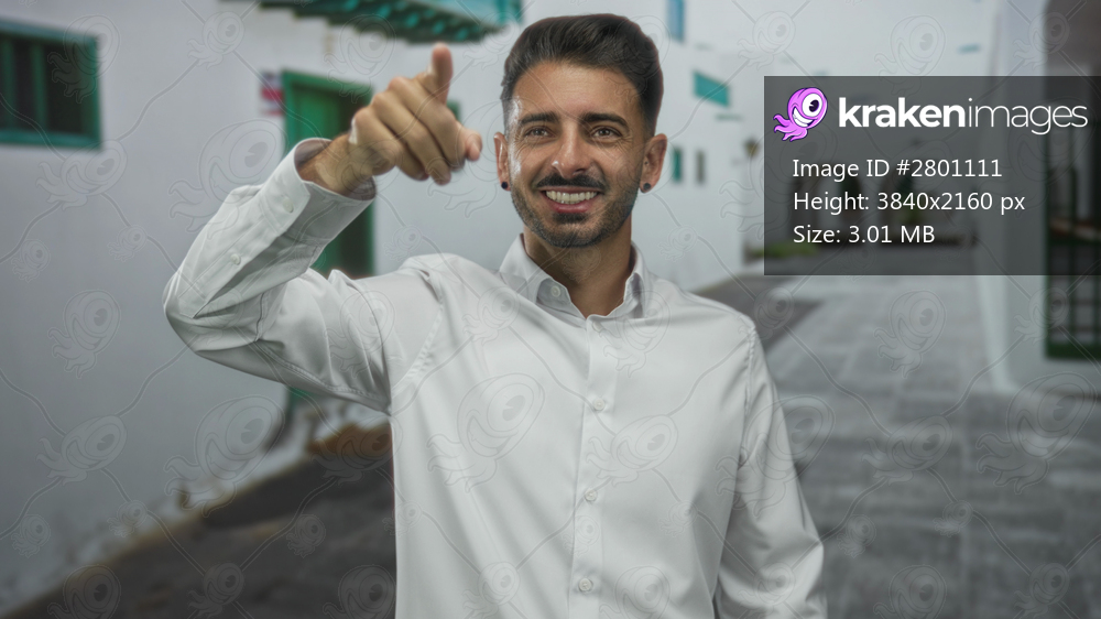 Man shading his eyes with one hand and pointing finger toward camera on a street lined with whitewashed buildings in bright daylight; curiosity exploration discovery wonder. - Kraken Images