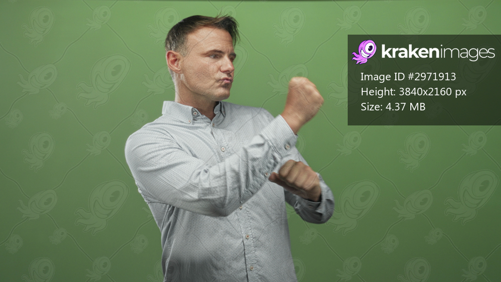 Man shadowboxing with clenched fists in green studio, throwing measured punches; training determination.