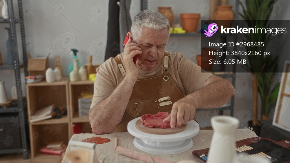 Man shaping clay with hand while holding phone to ear in pottery studio; craft patience concentration.