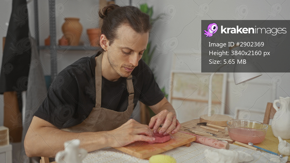 Man shaping clay with his hands on a wooden board at a studio table, wearing an apron; concentration craftsmanship patience.