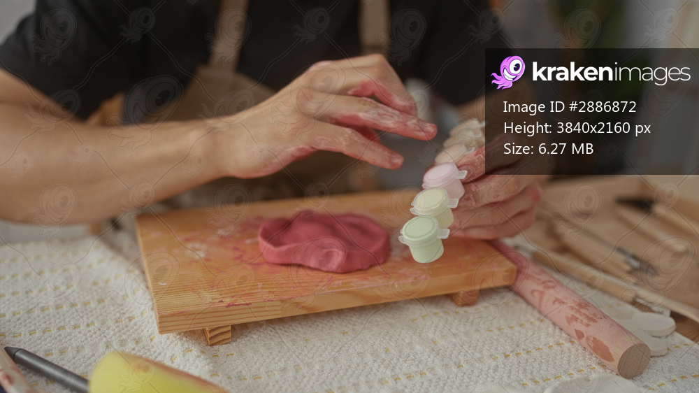 Man shaping clay with paint covered hands on a wooden board in art studio surrounded by small paint pots and sculpting tools; concentration.