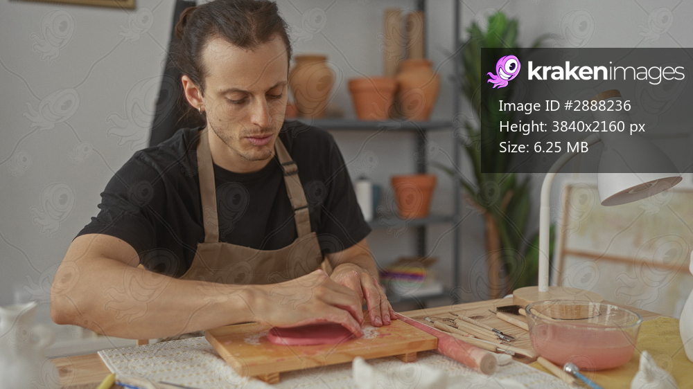 Man shaping pink clay with hands on wooden board in studio workspace wearing apron and using pottery tools; creative concentration.