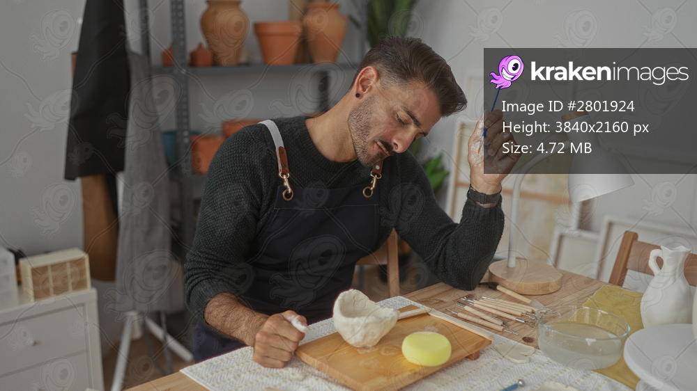Man shaping raw clay bowl with brush and hand at wooden table in artisan studio; mindful concentration.