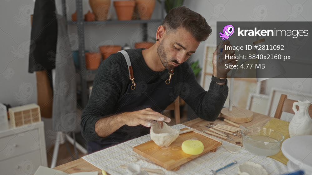 Man shaping raw clay bowl with brush and hand at wooden table in artisan studio; mindful concentration.