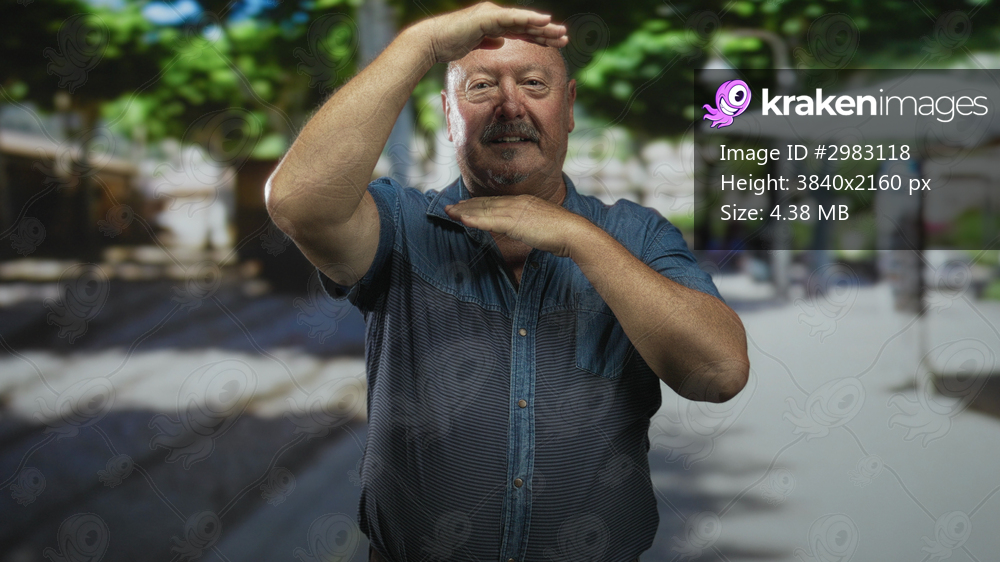 Man shielding eyes with hand and forearm visible standing on a sunlit street near a cafe umbrella, wearing short sleeve button shirt and mustache; travel curiosity. - Kraken Images