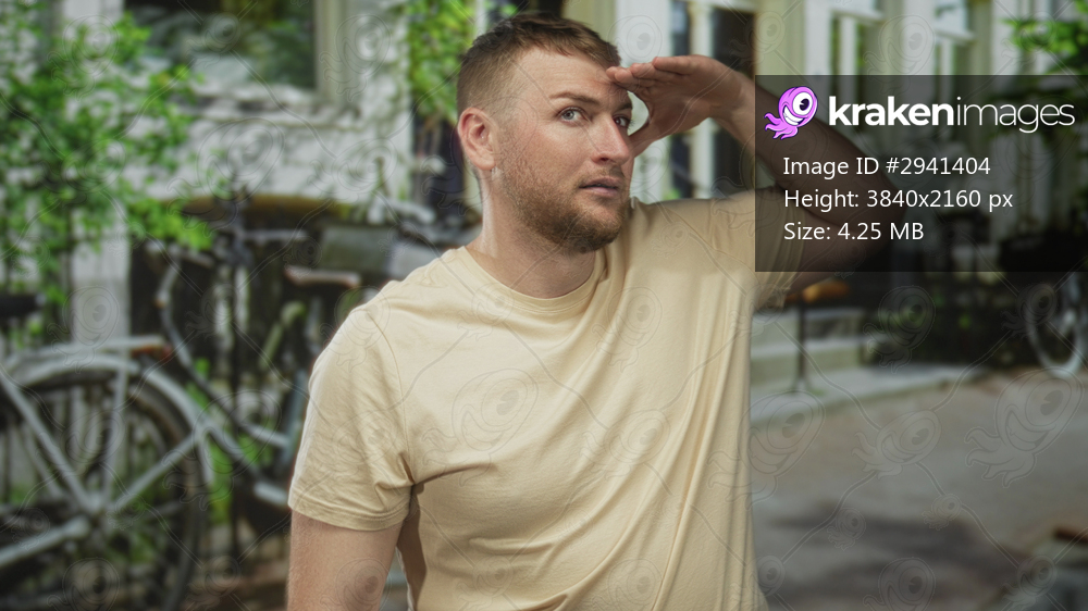 Man shielding eyes with hand to forehead on a city street in front of parked bicycles and a building wearing beige tshirt; curiosity exploration.