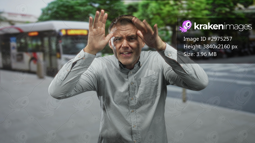 Man shielding eyes with hands on a busy urban street in front of a public bus, palms framing face as he peers toward traffic; concern observation.
