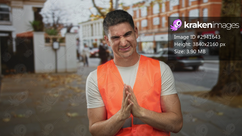 Man shielding hands and squinting on street wearing orange safety vest while rubbing his wrists and wincing; discomfort safety concern.