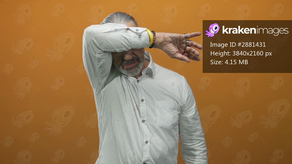 Man shields eyes with forearm in studio against orange backdrop wearing white shirt; fatigue reflection.