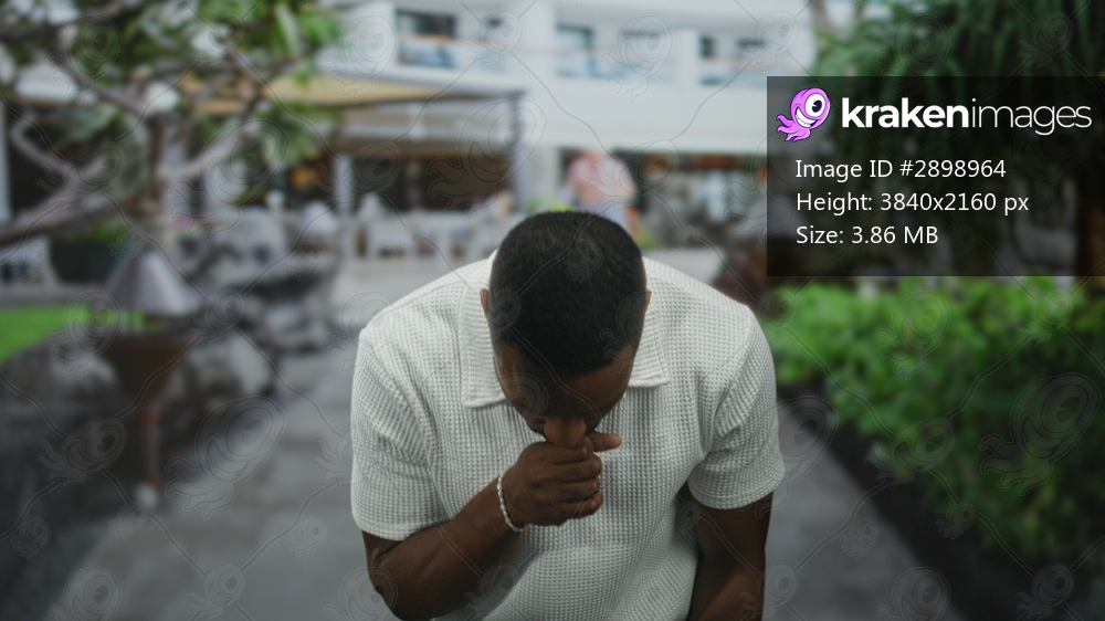 Man shields eyes with hand while pressing forehead in bright street setting near greenery and walkway; fatigue heat midday.