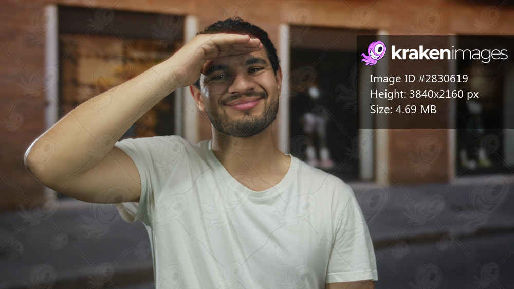Man shields his eyes with hand while looking upward on a sunlit urban street with storefronts; curiosity.