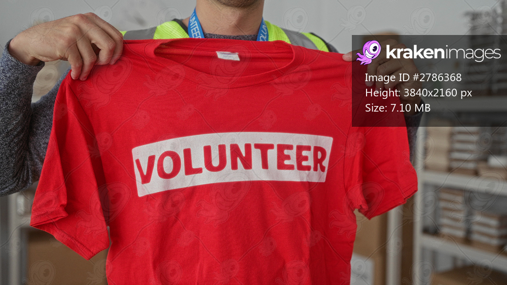 Man shirt holds warehouse box while young hispanic volunteer arranges donation charity tee.
