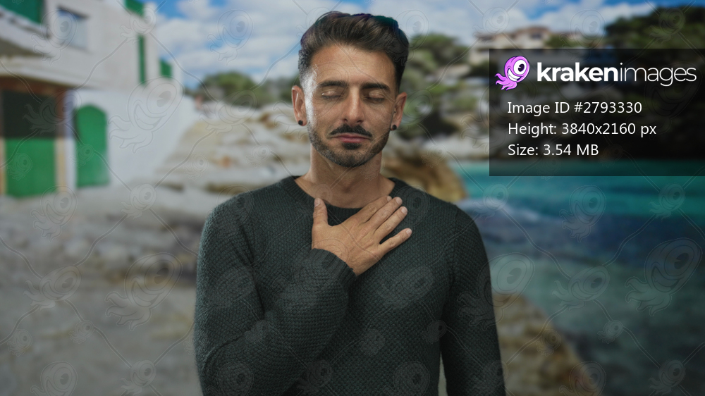 Man with short beard and bare ear studs places hand on chest in front of a coastal building with green shutters; sincerity gratitude.