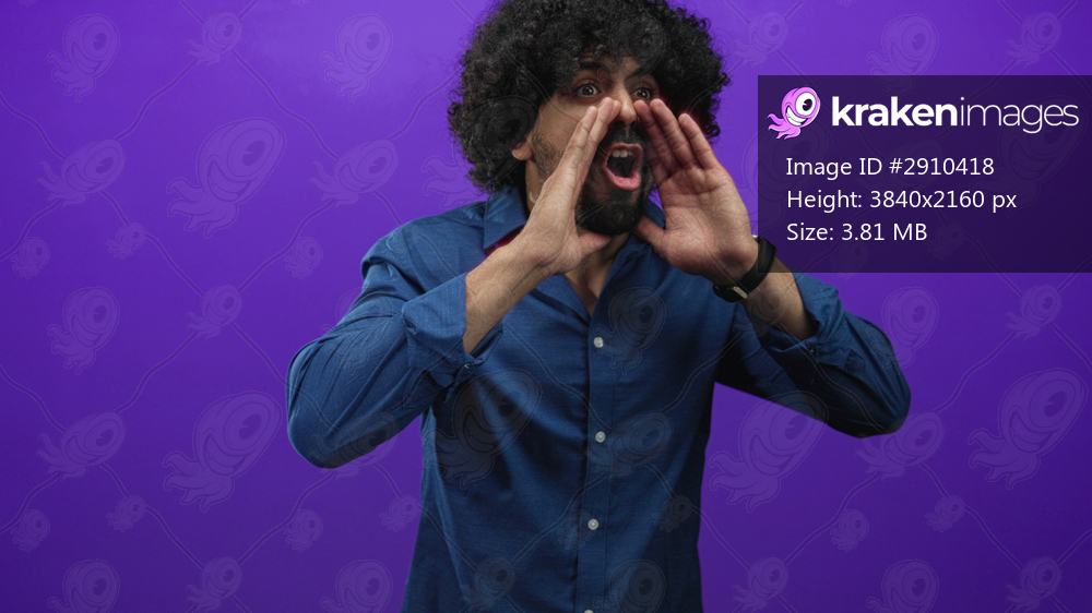 Man shouting with cupped hands in purple studio, wearing blue button shirt and black wristwatch, curly hair visible and mouth open; urgent message.